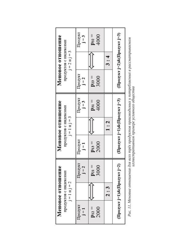 Таким образом имеем три «меновых» отношения для всех трёх продуктов производимых и потребляемых в рассматриваемом иллюстративном примере условного общества. Эти три меновых отношения представлены в таблице рисунка 11.