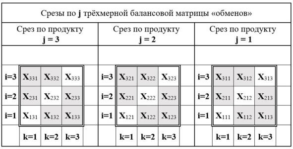 Для удобства восприятия матрица изображена в виде трёх вертикальных фронтальных срезов. Каждый из срезов отображает частную плоскостную двухмерную матрицу «обмена» по одному из j-ых видов продуктов между j-ыми иj-ыми агентами воспроизводственного процесса действительной жизни этого общества.