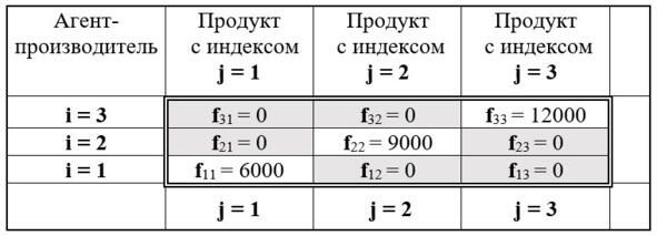 Обозначим общий суммарный объём производства jго продукта всеми агентами производства через j. Тогда, с учётом данных матрицы рисунка 12, отражающих численные значения заданного количества производства продуктов j-го вида j-ым агентом-производителем как величину jij, получим следующие три равенства (уравнения):