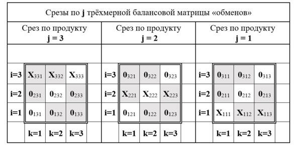 Рис. 14. Балансовая матрица, повторяющая три j-ых среза трёхмерной матрицы «обменов» рисунка 13, с обозначениями неизвестных переменных и переменных равных нулю