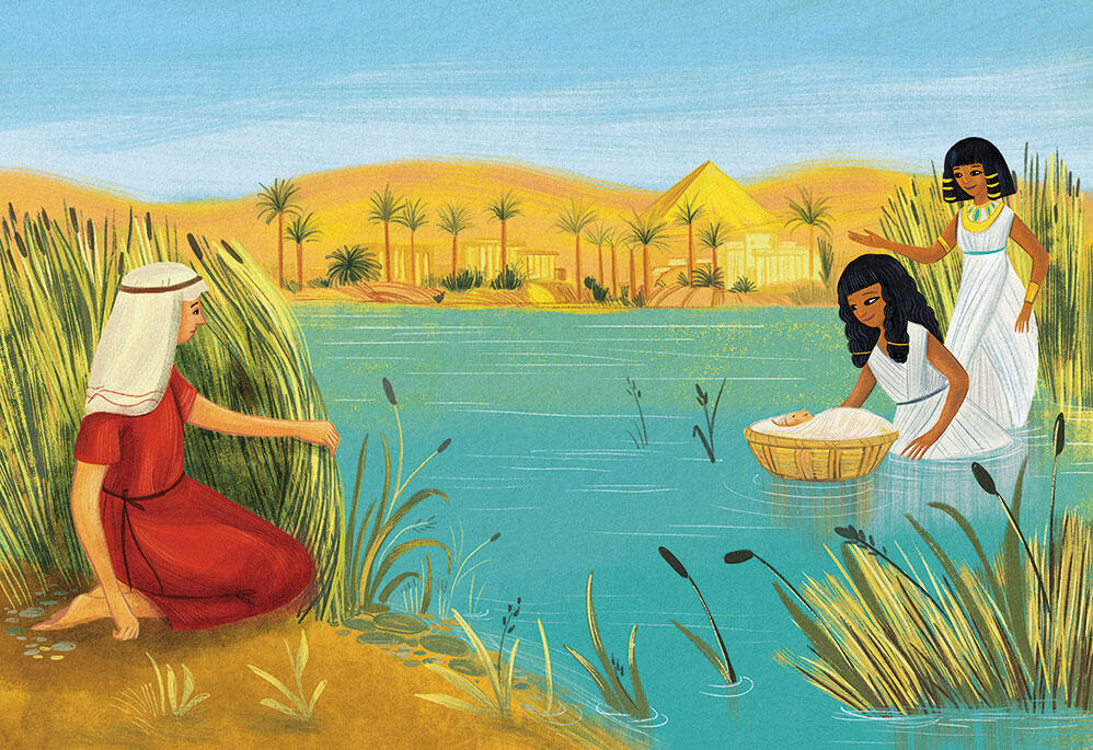 Чуть ниже по течению купалась со своими прислужницами дочь фараона; она заметила корзинку в воде. Сестра мальчика спряталась в тростнике, она видела, как дочь фараона взяла ребёнка и сразу же сказала: «Он такой маленький! Хочу взять его себе». Тогда девушка вышла из зарослей и обратилась к дочери фараона: «Ваше высочество, хотите, я найду вам кормилицу для этого младенца?» Та согласилась, и девушка побежала за матерью малыша, которая вскормила его, так никому и не рассказав, что это её сын. А Моисей рос здоровым и сильным под охраной дочери фараона.
