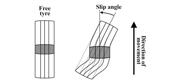 The figure schematically shows deformation of a tyre during front wheels sliding, when the front wheels are turned by the steering wheel at a large angle. Contact patch is marked gray. When braking, load on the front axle increases, so contact patch also increases. When understeer, the tyre deforming, contact patch rotates to direction of movement, and so-called tyre slip occurs. Tyre slip is angle of twisting of contact patch relative to direction of movement of the wheel. Steerability factor is defined as ratio of rear wheels contact patch to front wheels contact patch. If front tyres deformation exceeds rear tyres deformation, steerability factor is less than one. In this case, they say understeer or low steerability.
