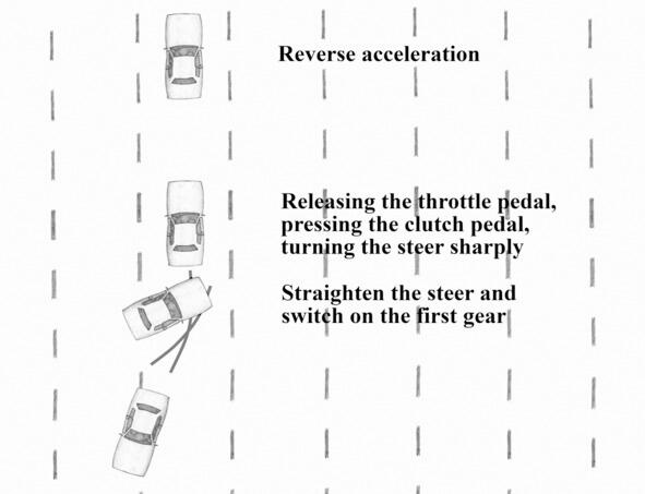 On a front-wheel-drive car engine braking when reversing creates oversteer. We should seize this. But so that the engine does not stall during perform the technique, it is necessary to press the clutch, when engine speed drops to idle. Let us show at the figure performing a turnaround on a front-wheel-drive car.
