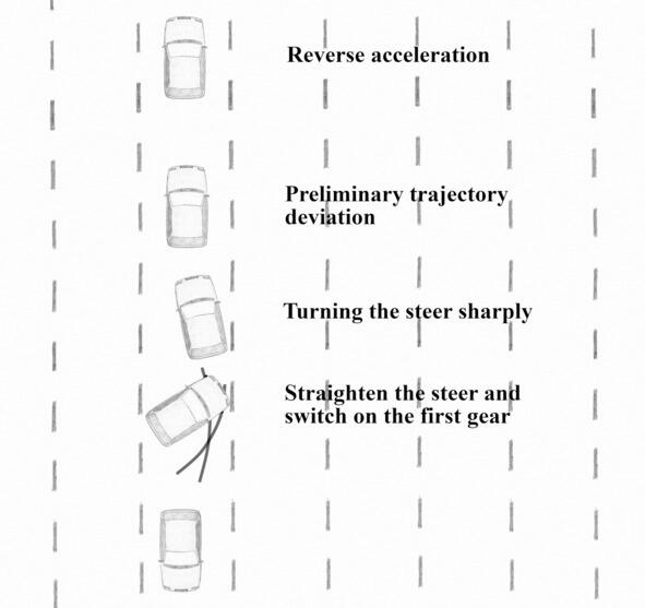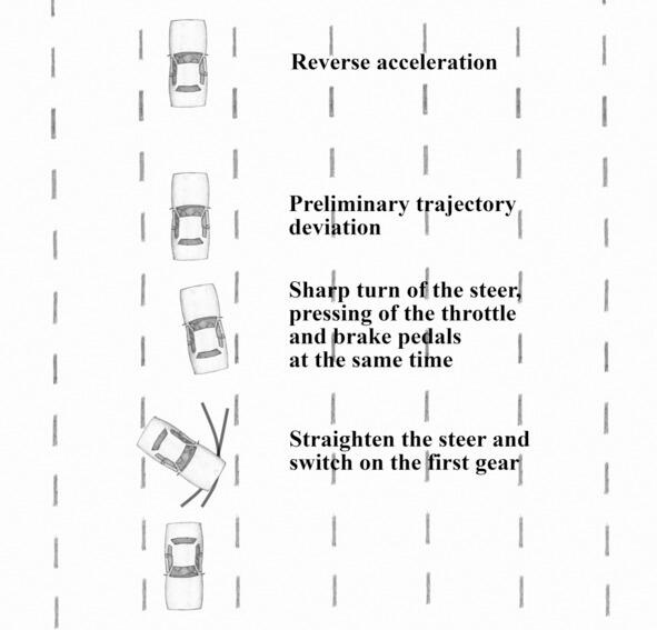 Firstly it is necessary to select the reverse gear and accelerate along a straight section of trajectory. It should be noted, that during reversing after releasing the throttle pedal the engine starts braking. Engine braking is a braking torque (some kind of braking effort). Braking on the rear axle while driving in reverse creates understeer, similar to how high braking effort on the front wheels causes sliding of the front axle when driving ahead. Therefore after performing acceleration it is necessary to disconnect the engine and transmission before performing the technique.