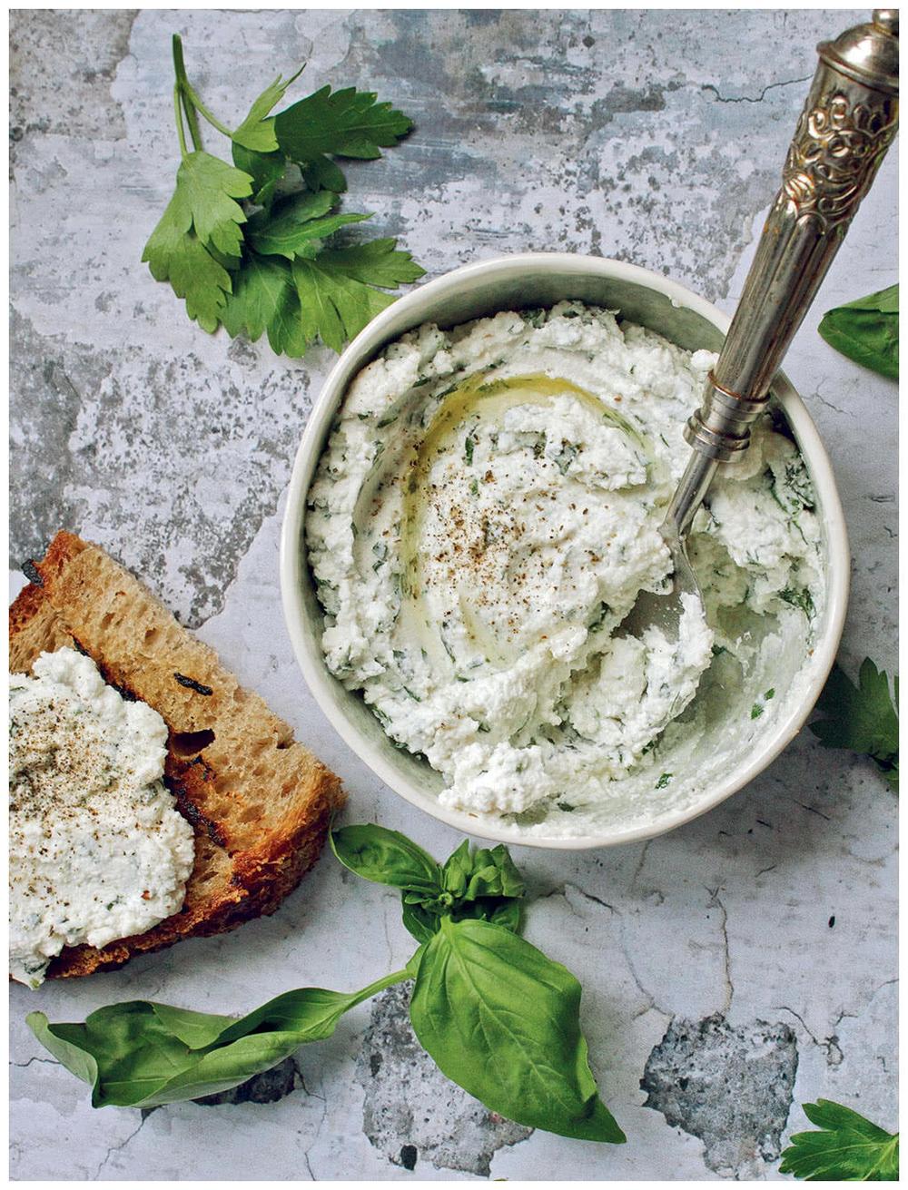 Рикотту выложите в миску и взбейте венчиком, добавив масло, цедру, соль и перец.