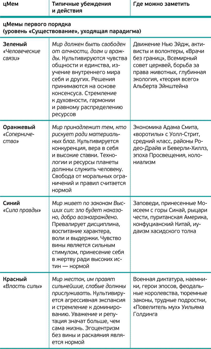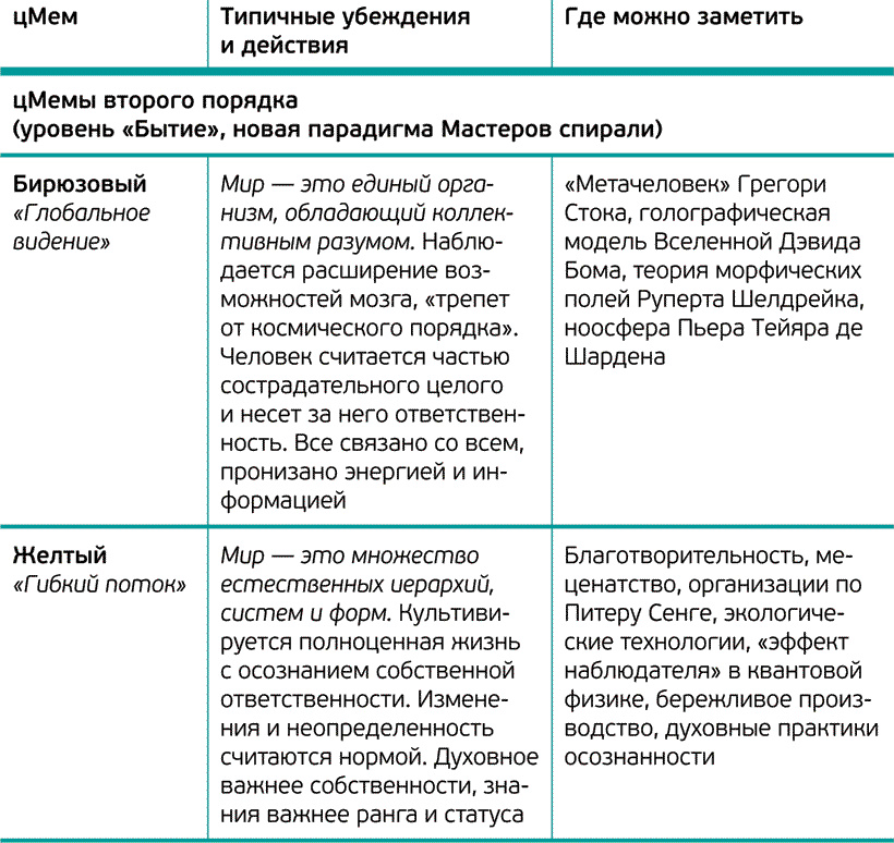 Шесть нижних цМемов (бежевый, фиолетовый, красный, синий, оранжевый и зеленый) авторы относят к категории «Существование». Два высших цМема желтый и бирюзовый к категории «Бытие», в которой высший приоритет получают гибкость, глобальное единство, компетентность и функциональность.