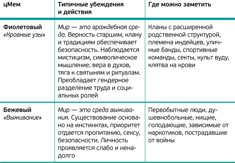 Человек может иметь разные уровни развития в отдельных областях: скажем, на работе быть оранжевым, а в семье зеленым. Так же и внутри организации: бухгалтерия может быть во власти синего цМема, отдел продаж во власти оранжевого.