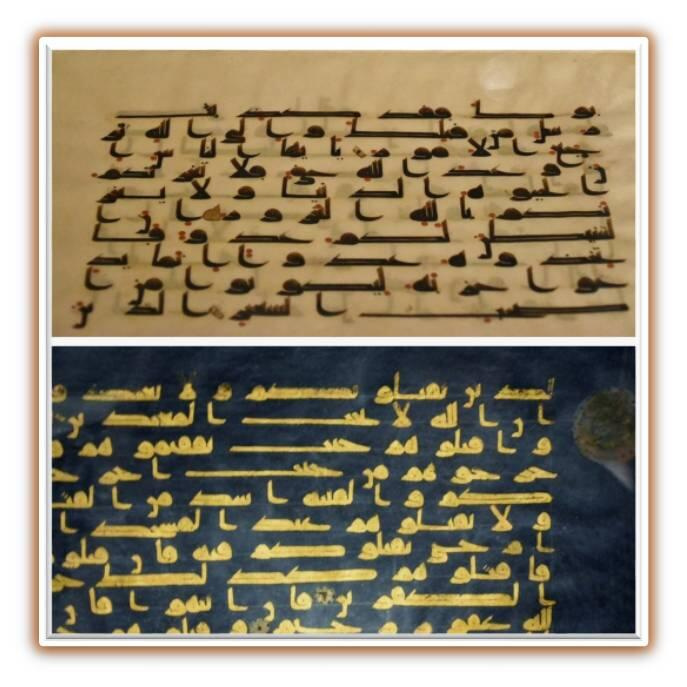 Рис. 5. Фрагменты пергаментных страниц Корана, выполненных каллиграфическим стилем письма «куфи» и «восточный куфи»,IX-XIвв.(The David Collection,Копенгаген, источникифото:https://en.wikipedia.org/wiki/Blue_Qur%27an)