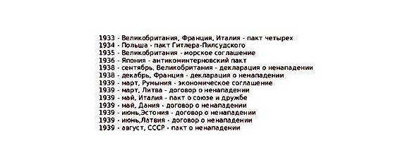Ремарка по истории 2: ни одно из этих Соглашений не послужило делу мира. При их заключении всё содержание каждого из перечисленного выше списка «союзов» по воле одного из подписантов вождя Третьего рейха Адольфа Гитлера, приводило, в конечном счёте, только к вооруженным столкновениям.
