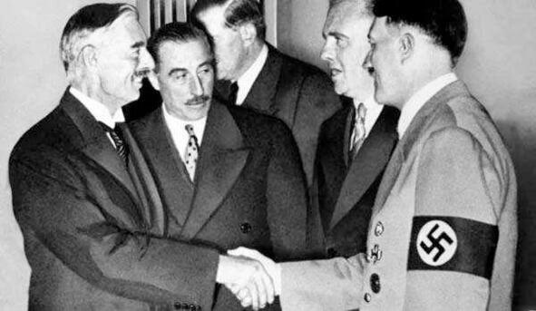 На снимке: в Мюнхене один из главных политиков «умиротворения» Гитлера премьер-министр Великобритании Чемберлен (слева) жмёт руку Гитлеру, как знак будущего мирного сосуществования европейских стран.