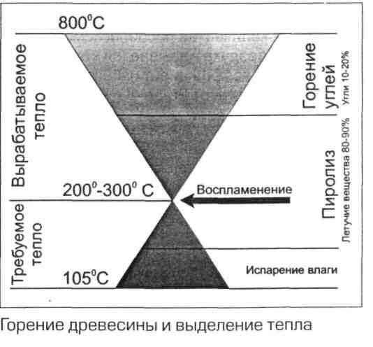 В интервале 200300ºС происходит воспламенение твердого топлива. Сухая солома воспламеняется при температуре около 200ºС, сухой торф при температуре 225280ºС, сухая древесина 220300ºС. При температуре 500600ºС начинается процесс горения летучих компонентов, содержание которых в горючем веществе составляет около 75 %. В интервале 800900ºС происходит сгорание твердого углерода и смолы, образующие при этом дымогарные газы дожигаются в камере с подачей воздуха (газогенераторный процесс). При этом дополнительное выделение тепла повышают температуру газов до 10001100ºС. В полученной газо-воздушной смеси сгорают токсичные образования, тяжелые соединения и частицы сажи.