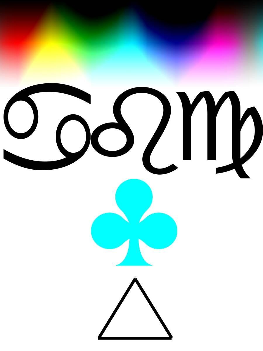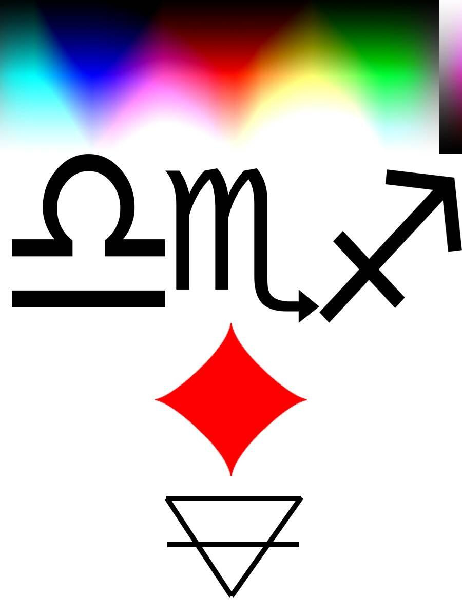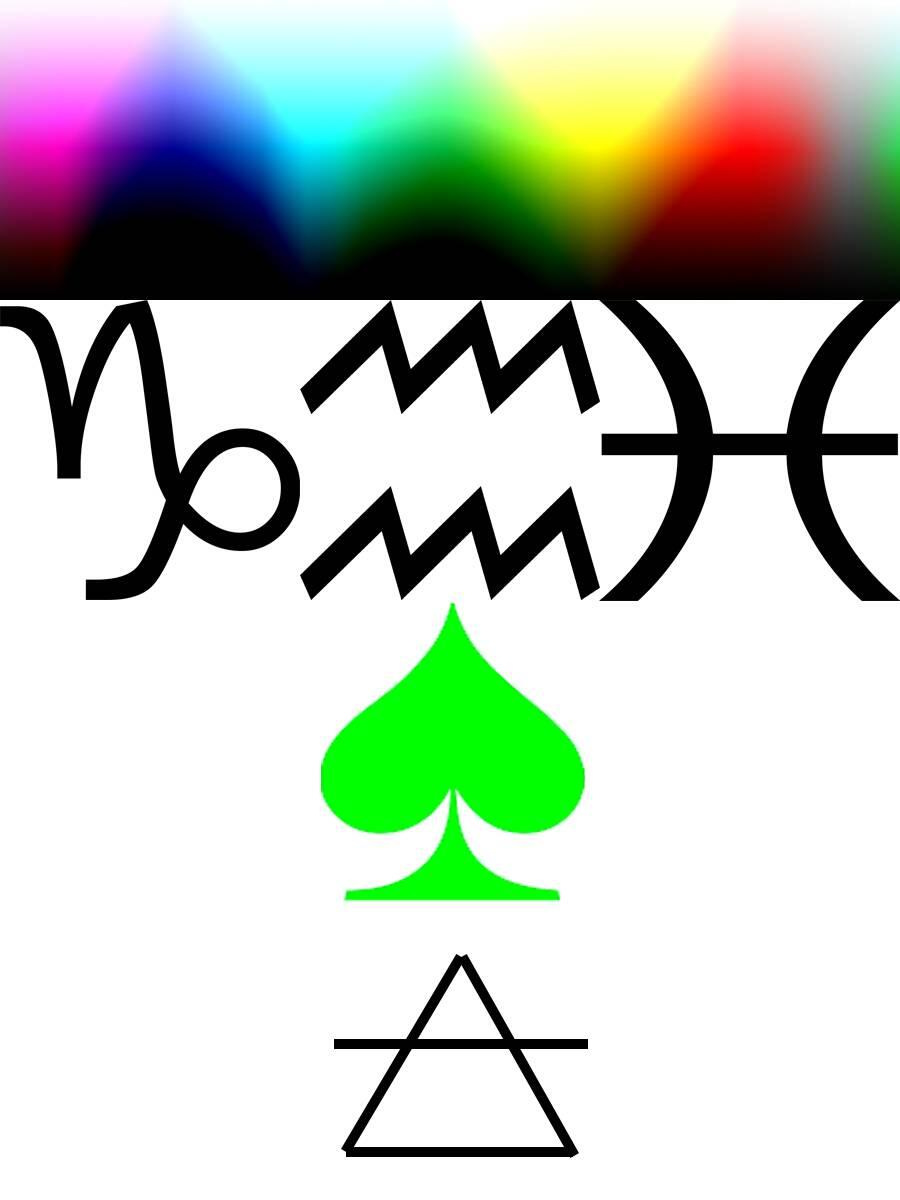 Я располагал 4 части возможных комбинаций направления и внутреннего следования цветов, так что бы можно было получить в них очертания и смысл 12 знаков зодиака. Здесь я хочу предупредить читателя, что сейчас весь скепсис, если он есть, по поводу астрологии, нужно приберечь до главы «Астрология», здесь же нам нет никакой необходимости верить в астрологию, нужно просто посмотреть на некоторые совпадения. А явственность этих совпадений безусловно зависит цветовой модели, здесь всё в RGB-цветах, а в иных моделях получается иначе. Но давайте, на секундочку допустим, что древние и не очень древние оккультисты видели внутренним взором, либо как-то оптически получали эти изображения, и, обводя их контуры, получали некоторые символы. Вспомним хотя бы Исаака Ньютона, который почти открыл Малый Порядок Эманаций, но из-за стремления свести всё к семи категориям, неправильно понял своё открытие. Чисто гипотетически посмотрим на наложение где-то стройно, а где-то не очень, Знаков Зодиака и других символов: