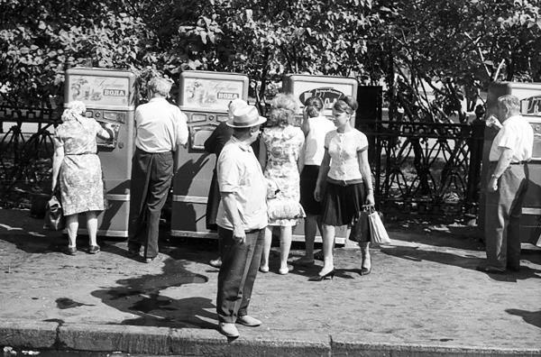 Автоматы с газированной водой. Стакан: 1 копейка, а с сиропом 3 копейки