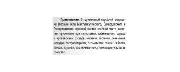 По [64]: лист, прием по 0.2 г, в день не более 0.8 г, равно по действию белладонне, судорожные и воспалительные страдания дыхательных, пищеварительных и мочеполовых органов. По [ВО]: семена антиглистное.
