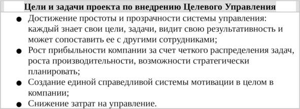 Таб. 1. Цели и задачи проекта по внедрению Целевого Управления