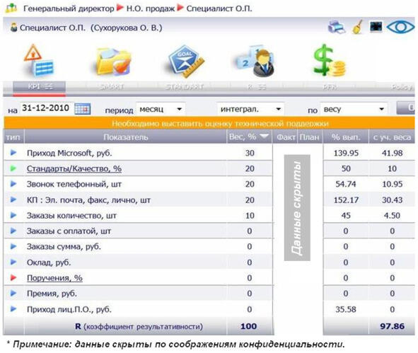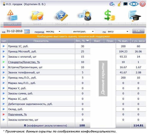 Разрабатывая индивидуальный состав показателей мы опирались на те работы, те направления (1С, Microsoft) где по каждому показателю производится ежедневный расчет. И это матрица в виде плана и факта. Здесь большие цифры связаны с декабрем. Мы старались учитывать планирование, но декабрь, как и во многих компаниях, является месяцем хитов, когда многие показатели перевыполняются и перевыполняются даже в несколько раз. Это связано с особенностями нашей экономики.