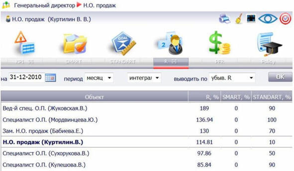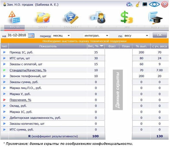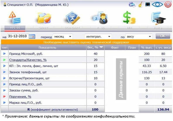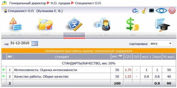 Необходимо было выработать индивидуальный набор показателей для каждого специалиста и посмотреть на те цели и задачи, которые мы требуем от него. Соответственно, мы проработали с каждым сотрудником этот состав услуг и продуктов и стартовали. Сейчас прорабатываем матрицы для специалистов из отдела продаж, для специалистов проектного управления, отдела рекламы. То есть вы вырабатываете ту концепцию и то видение результатов работ, которые вы хотите получить от специалиста. Если нам необходимо повысить качество работ значит повышаете приоритеты по показателям и вес этих показателей, больше делается упор на качество. Для продавцов, в первую очередь, важен показатель поступления продаж. Мы выставляли тот набор показателей, который для того или иного менеджера наиболее важен.