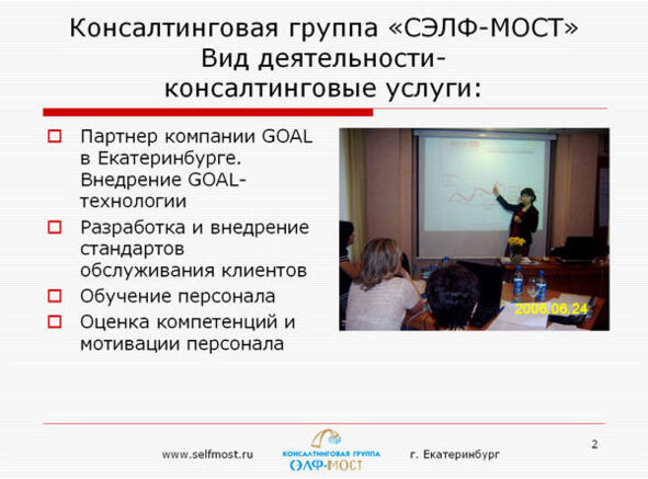 Продукты Консалтинговой группы «СЭЛФ-МОСТ»: разработка и внедрение стандартов обслуживания клиентов, постановка системы продаж, обучение персонала, оценка компетенций и мотивации персонала. Наша область это кадровый консалтинг.
