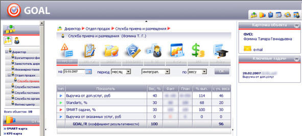 А внедрять сразу одновременно на 87 сотрудников, поверьте мне, требует очень много времени, сил. Со стороны менеджмента ничем другим не занимаешься, как только разрабатываешь эти показатели деятельности для сотрудников. (Время осознания показателей и формирования матриц на 87 сотрудников 510 дней, включая обсуждение и согласование. Для это надо уметь оперировать понятиями «KPI-КАРТА», «универсальные» и «ближайшие» KPI. Прим. компании «Целевое Управление»). Поэтому на сегодняшний день я считаю, что мы поступили правильно. На уровне служб отделов уже четко работает эта система. Все имеют представление о GOAL-технологии, и каждый менеджер пока отслеживает эту систему вручную. У каждого есть свои формы учета по каждому сотруднику. Оценка каждого происходит в ежедневном режиме, но все это вместе оформляется в рамках службы. Я считаю, что это правильно, потому что когда мы докупим и расширим систему до каждого отдельного сотрудника, все будут иметь общее представление о том, как система работает. Намного проще это будет внедрять, и объяснять тем же горничным и сотрудникам тех. службы, как GOAL-технология должна работать.