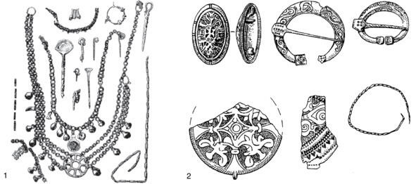 1. Нагрудные украшения Води: узкое рисикко (risikko), широкое мюэци (myätsi). 2. Предметы из погребений Инкере-Войскорово на реке Ижора XII XIII вв. // Конькова О. И. Водь 2009 г.