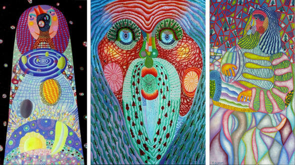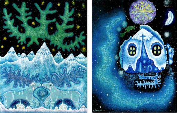 Художник-этнофутурист Владимир Фомин: 1. Языческий огонь голубых скал. 2002г. 2. Северный город. 2002г. 3. Творение Ильматар. 1997г. 4. Лесной царь Тапио. 1996г. 5. Вяйнё играющий на кантеле. 1998г.