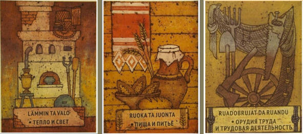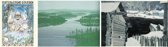 Знаменитые художники Карелии: 1. Карельские сказки. Николай Брюханов. 1977г. 2. Карельские озера. Мюд Мечев. 1979г. 3. Ладвинский пейзаж. Томара Юфа. 1964г.