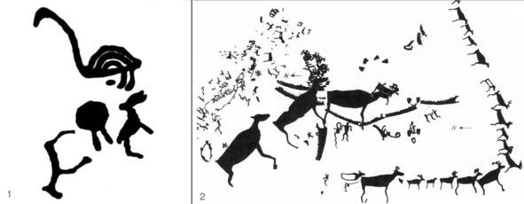 1. Онежские петроглифы, изображающие зарождение вселенной. Пудожский район Карелии, восточное побережье Онежского озера. 2. Беломорские петроглифы, изображающие сцены охоты. Беломорский район Карелии, острова реки Выг. IV III тыс. до н э.
