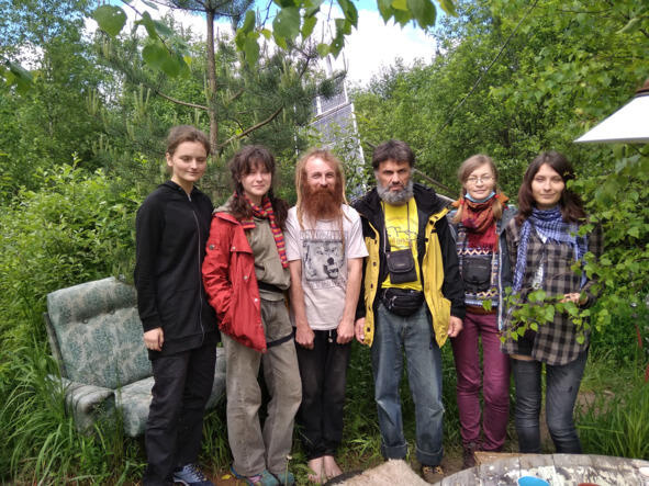 На фото: Маша Макарова, Аделина Копыльцова, Хоббит-отшельник, Антон Кротов, Катерина Боярова и Кира, рядом с входом в землянку.