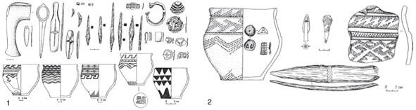 Погребальный инвентарь: 1. Алакульская культура. 2. Федоровская культура (по В. В. Евдокимову, В. В. Варфоломееву. // Байпаков К. М., Таймагамбетов Ж. К. Археология Казахстана