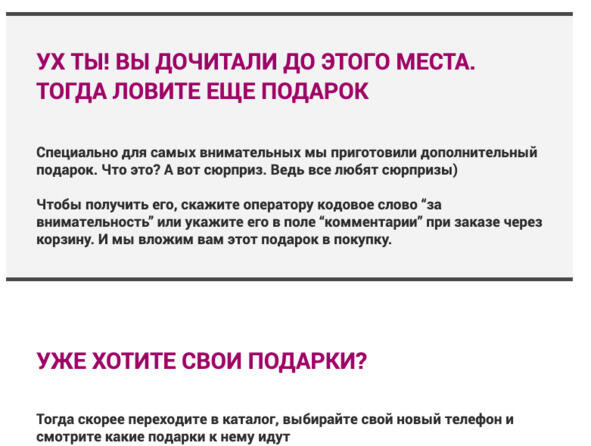 Данную идею можно еще усилить, что мы и сделали. На странице с описанием подарка есть небольшой секрет: если дочитать весь текст до конца, можно получить еще один подарок, «за внимательность».