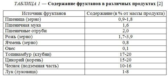 Фруктаны это сложные углеводы, которые состоят из нескольких молекул фруктозы, соединенных между собой в цепочку. Бóльшая часть фруктанов представлена небольшими по длине цепочками, составленными из 29 «звеньев» фруктозы; они носят название фруктоолигосахариды. Если же этих звеньев более 10, то такие фруктаны называются инулином. Не сомневаемся, что многие из наших читателей слышали про инулин, особенно в контексте его пребиотического эффекта. Известно, что некоторые растения запасают углеводы в виде инулина: очень много этого вещества в топинамбуре и цикории (cм. таблицу 1).
