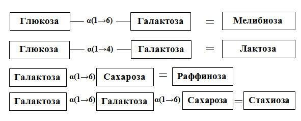 Б. Олигосахариды состоят из нескольких (3 и более) простых углеводов; к ним относятся, например, раффиноза, стахиоза и вербаскоза; особенность этих олигосахаридов заключается в том, что сахароза в них связана с галактозой α (16) -гликозидной связью (схема 2).