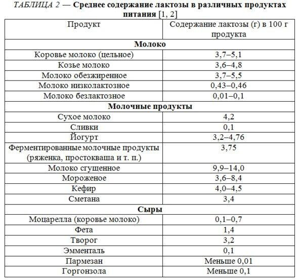 В таблице 2 представлены сведения о содержании лактозы в различных молочных продуктах. Мы видим, что наибольшее количество этого углевода находится в цельном и сгущенном молоке, а наименьшее в твердых сырах. Еще больше информации о лактозе в молочных продуктах можно найти в приложении 1.