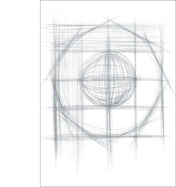 Теперь в большой квадрат вписываем окружность. Она выполняется непрерывным круговым движением в одну сторону. Движение должно быть равномерным, ритмичным. Карандаш относительно линии горизонта все время под одним углом, т.е., рука не должна вращаться относительно своей продольной оси. Сначала линия слабая, затем, когда карандаш начинает попадать в окружность, нажим усиливается. При правильной посадке, когда рука перпендикулярна середине мольберта, она работает как циркуль.