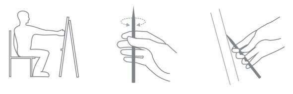 До мольберта расстояние вытянутой руки, рука перпендикулярна середине мольберта. Карандаш должен свободно вращаться относительно большого пальца с помощью остальных пальцев. Кисть руки в естественном положении, не выворачивается, костяшки указательного пальца касаются бумаги.