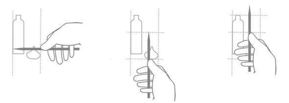 Визирование. Это делается так: берем произвольный измеритель (чаще всего это карандаш или древко кисти) таким образом, чтобы он был свободным концом визуально совмещен с одним краем измеряемого предмета, а другой край этого предмета отмечаем большим пальцем. При этом обязательно надо соблюдать два условия: