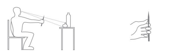 Измеритель держат на вытянутой руке и перпендикулярно лучу зрения. Для этого нижний его конец подпирается мизинцем.