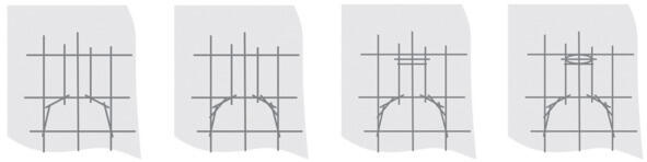 Сначала находим на габаритных линиях по пропорциям четыре крайние точки. Далее от найденных точек по направлениям строим восемь прямых. Остальное дорисовываем «на глазок».
