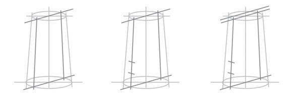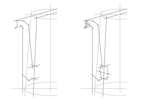 Следующее построение построение ширины ручки. Линии ширины или линии переломов будут перпендикулярны плоскости симметрии, что очевидно при взгляде сверху.