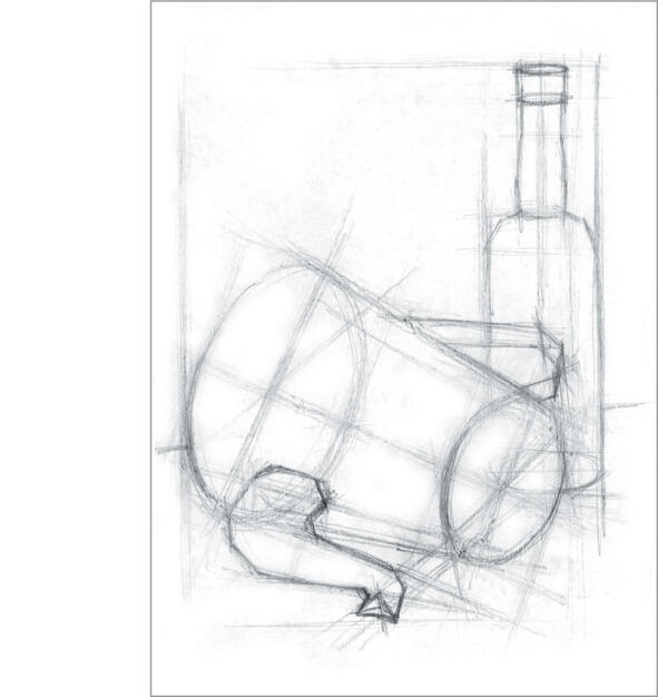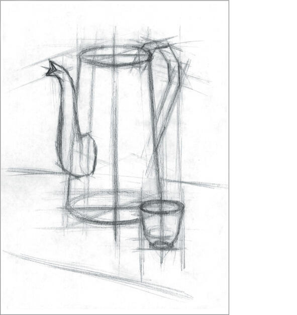 Перед началом занятия выполняем упражнение (см. занятие первое). На пятом занятии мы выполним конструктивный рисунок лежащего кофейника и бутылки. Дополнительного объяснения требует рисунок лежащего кофейника.