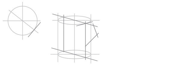 Затем надо построить ломаную линию середины ручки. Это делается по направлениям. Но, чтобы выяснить направление первого отрезка относительно верхней плоскости цилиндра, надо заглянуть на кружку сбоку (просто подойти сбоку и заглянуть). В нашем случае отрезок совпадает с верхней плоскостью цилиндра, а значит и с линией пересечения этой плоскости плоскостью симметрии.