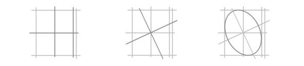 Перпендикулярно большой оси строим малую через тот же центр. Вписываем эллипс в габариты в соответствии с направлениями осей. Обратите внимание, что крайние точки эллипса по осям не доходят до линий габаритов, т.к. эллипс относительно габаритов повернут.