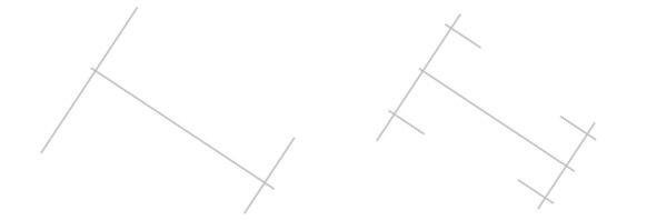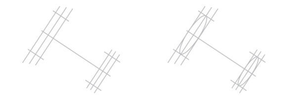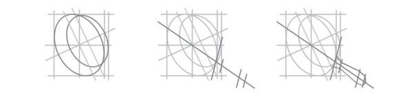 Если нет, то корректируем направление средней линии ручки, далее то же самое что и в первом случае. Направления линий связи, по которым строятся симметричные точки отмечающие ширину ручки, в любом случае будут параллельны касательной к эллипсу краев в точке пересечения его плоскостью симметрии или, другими словами, в точке середины входа ручки.