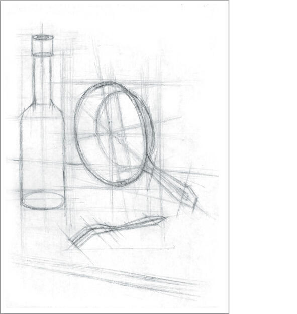 Перед началом занятия выполняем упражнение (см. занятие первое). На шестом занятии мы выполним конструктивный рисунок сковороды в произвольном повороте, вилки и бутылки.