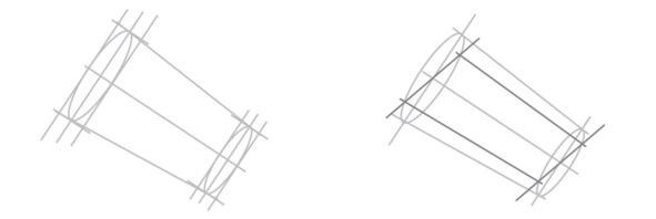 Построение сковороды. Сковорода является в основе усеченным конусом, как и кофейник. Но в усеченном конусе сковороды размер оси вращения так мал, что определить ее направление невозможно. Мы воспользуемся направлениями больших осей, которые можно определить по точкам пересечения эллипсов дна и края сковороды. Если эти две точки соединить прямой линией, то эта прямая будет параллельна большим осям эллипсов дна и края сковороды, но не идентична этим осям.