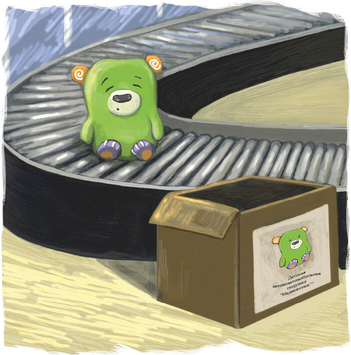 Медвежонок упал на конвейер, и его понесла какая-то неведомая сила. С боков его приятно обдувал теплый ветерок. Медвежонок не мог понять, что с ним происходит. Затем его сморил сон, и он не почувствовал, как мягко перелетел с ленты конвейера в просторную коробку. На коробке был нарисован портрет медвежонка, а под портретом была надпись: «Детская автомобильная подушка «Медвежонок» (мягкая игрушка).