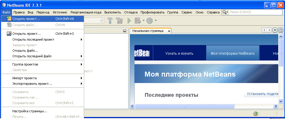 Для создания консольной программы необходимо выбрать в меню опцию «Файл» «Создать проект»: