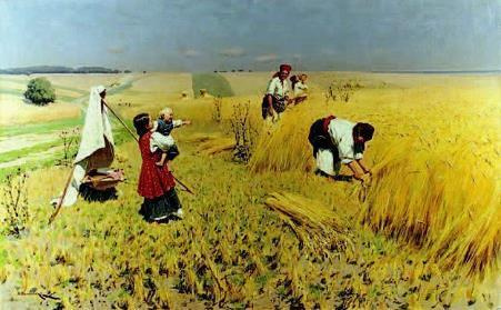 Вслед за сенокосом наступала жатва, работа тяжелая, но радостная. Женщины надевали, как на праздник, яркие кофточки, повязывали белые косынки на головы, обували лапти, чтобы не повредить ноги. Начинали работу рано, когда высыхала роса, и заканчивали поздно вечером. Целый день, нагнувшись, под палящим солнцем срезали серпом с корня рожь.