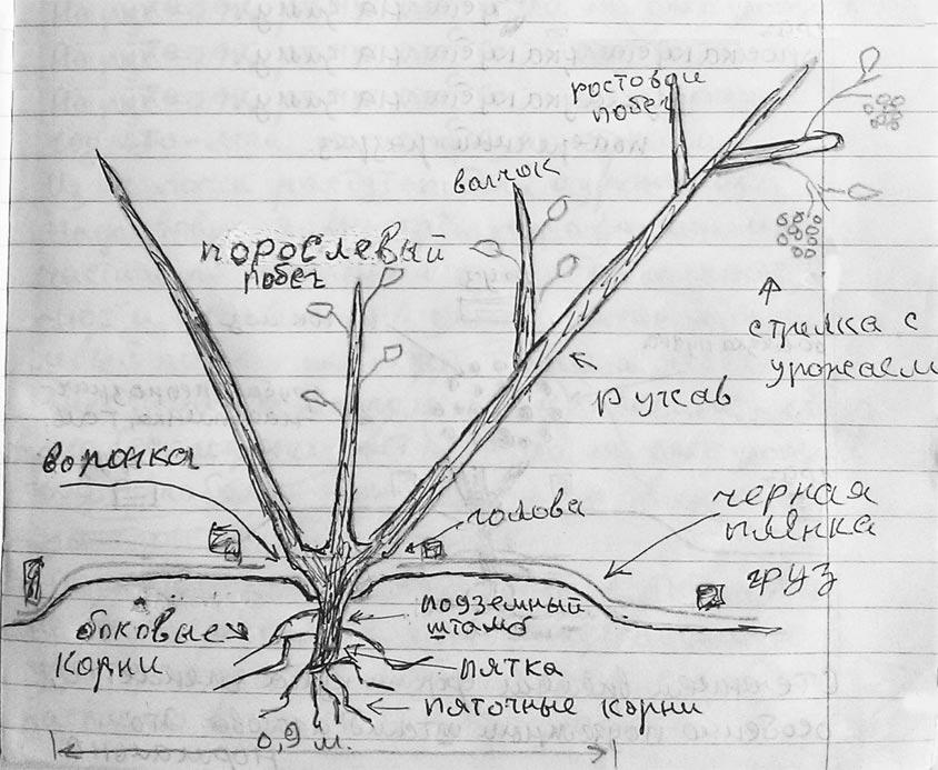 II. Схема виноградного кустаПрошу сразу усвоить некоторые термины, которые нам понадобятся. Часть из них проиллюстрирую схемой виноградного куста веерной формировки на два рукава. Схема упрощенная показаны лишь отдельные части куста для введения в терминологию, принятую у виноградарей. Надо сказать, что в разных местностях термины могут отличаться от стандарта.