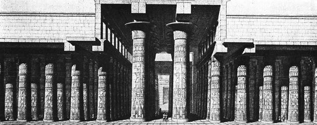 Силой художественного образа гипостильный зал Карнака обязан прежде всего пропорциям пространства: высота и длина его колонных коридоров несоразмерно велика по сравнению с их шириною, что вызывает у зрителя впечатление стесненности пространства с боков и, наоборот, «сверхчеловеческой», подавляющей высоты пространства над головой. С боков надвигаются на зрителя каменные колонны, сверху избыточное пространство, насыщенное таинственной жизнью висящих над головою архитектурных форм и изображений (рис. 6). Мощи пространства соответствует необычайная мощь колонн и лежащих на них толстых каменных балок. Колонны двух типов, восходящих к подражаниям пучку стеблей, цветов и бутонов папируса. Но от легкого тростника-папируса в этих тяжеловесных колоннах осталось самое отдаленное воспоминание. Книзу их как будто распирает от собственного веса и давящей на них тяжести; у самого же основания они вновь сужаются, словно воткнутые в каменное кольцо стягивающей их круглой каменной плиты. В форме головной, верхней части (в капители) одного типа колонн еще раз повторяется мотив оседания и распирающей изнутри силы и очень выразительно подчеркивается упор колонны в положенный поверх нее толстый квадратный камень (рис. 2). В другом типе колонн головная их часть разработана в виде раскрывающейся кверху огромной вазы, которая несколько больше, чем другие детали, напоминает форму распускающегося цветка (рис. 1). Сосредоточение наибольшей выразительности в головных частях колонн выявляет значение высоты, верхней зоны и потолков гипостильного зала, что еще больше подчеркивает его грандиозность. Впечатление огромности и мощи колонн усиливается от подобия их формы меньшим по сравнению с ними формам растительного мира.